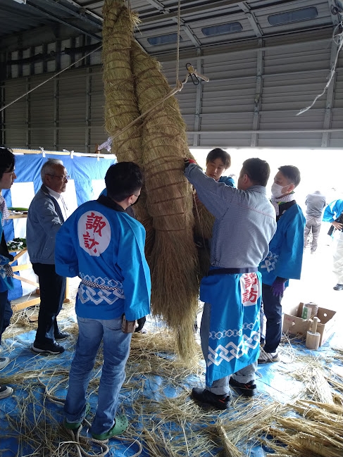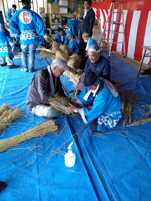 「諏訪神社網打保存会」や「奉仕団」の方々30名余が集まって、藤島建設車庫にて綱打ちを行いました。