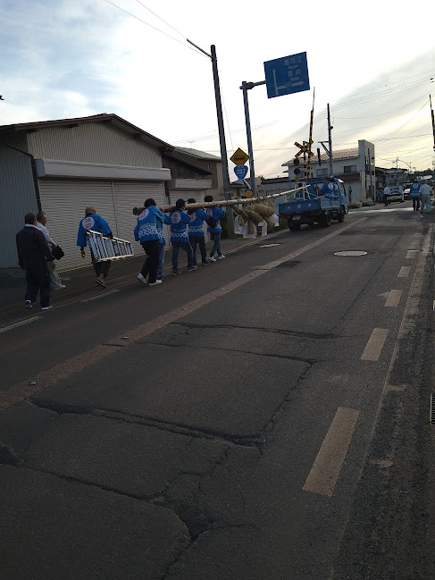 大きく立派な注連縄ができると、当社より注連縄を担いでお囃子と太鼓と共に町内を練り歩き