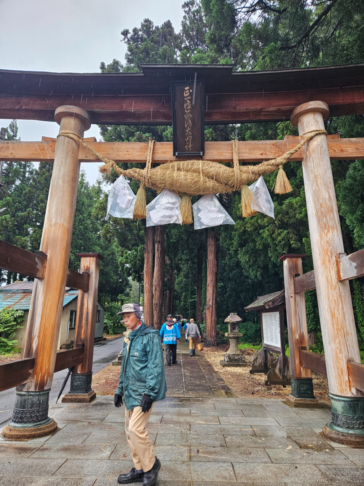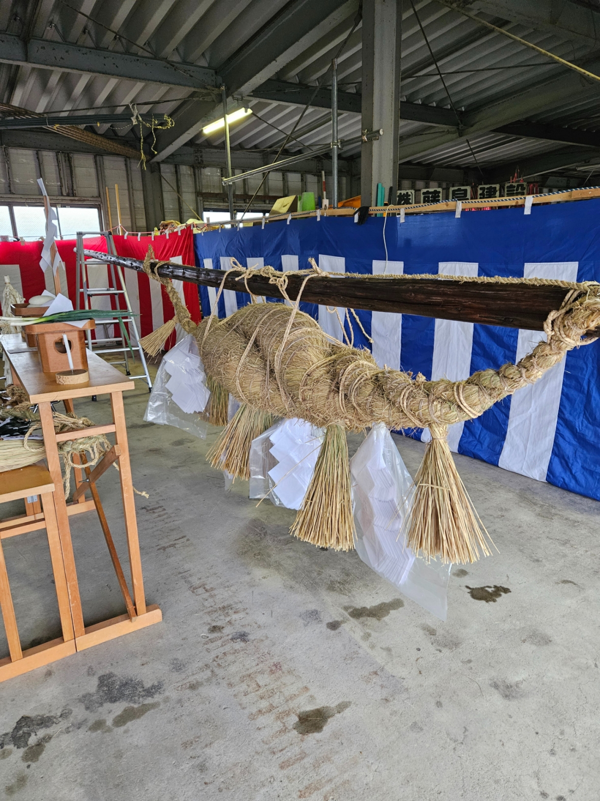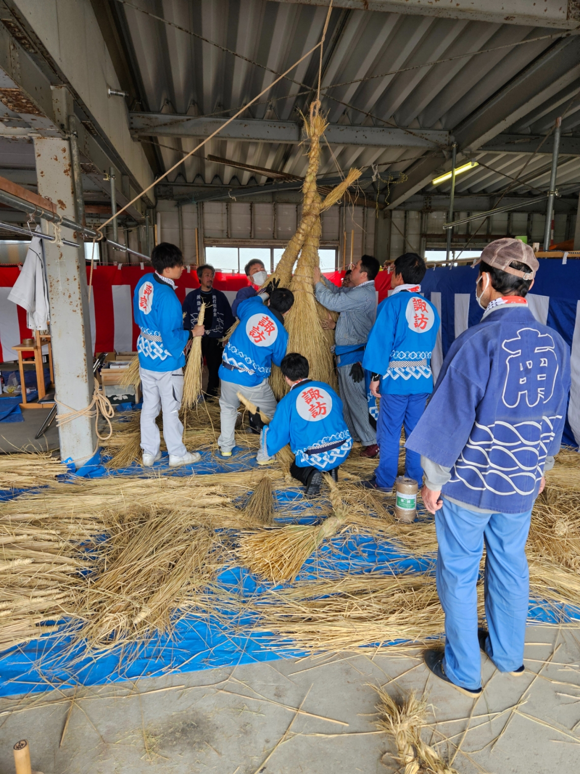 2024年06月03日(月) 諏訪神社注連縄奉納 2024年6月2日、藤島建設車庫にて諏訪神社注連縄作りが行われました。 当日は悪天候でしたが、諏訪神社綱打ち保存会の方々や奉仕団の方々、約50名が集まり 去年の人数を大幅に上回った人数で注連縄作りが行われました。 大きく立派な注連縄ができると、諏訪神社まで移動し、大鳥居には無事新しい立派な 注連縄が奉納されました。 お集まりいただいた保存会や地域の皆様、朝早くから大変お疲れさまでした。